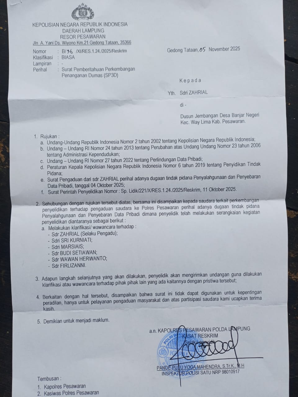 Kepolisian Negara Republik Indonesia Daerah Lampung Resor Pesawaran melalui Satuan Reserse Kriminal (Satreskrim) telah menerbitkan Surat Pemberitahuan Perkembangan Penanganan Dumas (SP3D) Nomor: B/136/XI/RES.1.24./2025/Reskrim atas laporan Zahrial, warga Dusun Jembangan, Desa Banjar Negeri, Kecamatan Way Lima, Kabupaten Pesawaran, terkait dugaan tindak pidana penyalahgunaan dan penyebaran data pribadi.